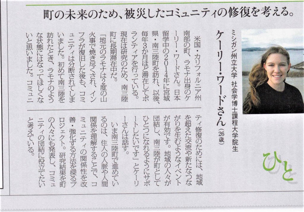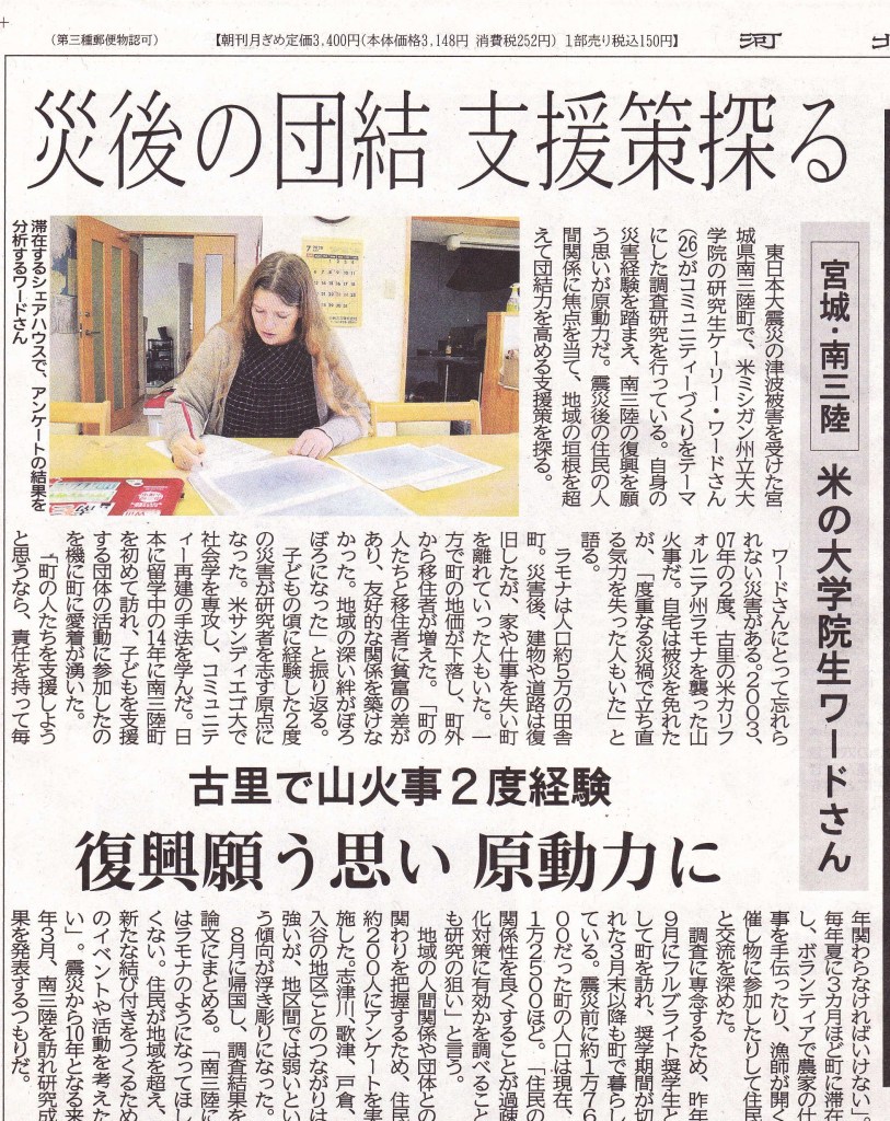 Interview by the Kahoku Shinbun on my connection to disaster and my work in Minamisanriku to promote town unity.