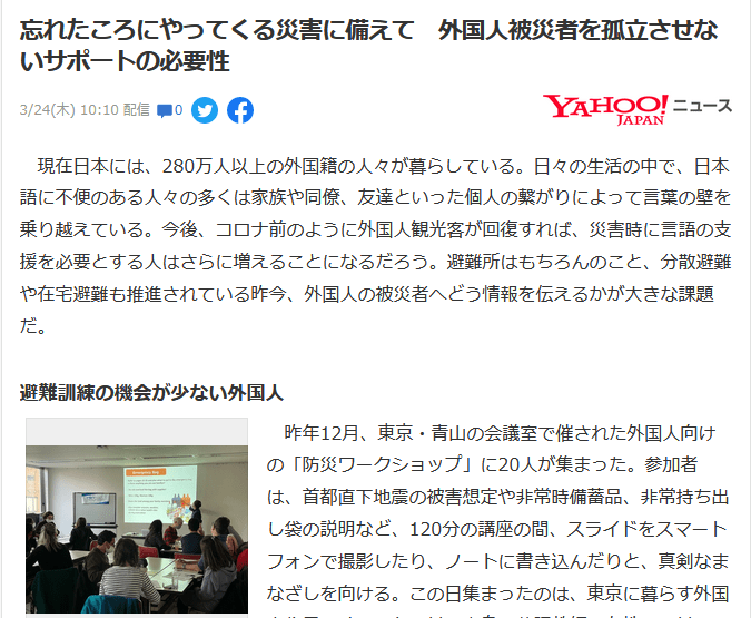 Interview with Yahoo! Japan News about the special resources needed for foreign residents in Japan and how foreign residents mobilize resources during disasters.